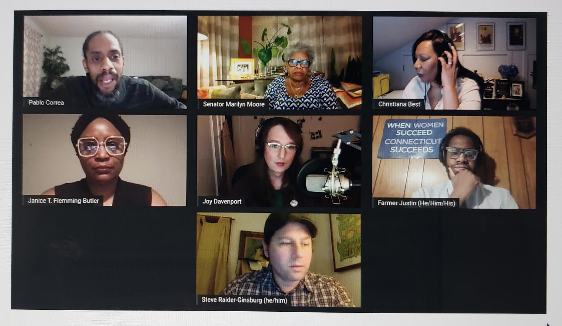 Pablo Correa on a panel discussion following a screening of Fannie Lou Hamer’s America documentary film. Fellow panelists include: the film’s director Joy Davenport, Connecticut Senator Marilyn Moore, Hamden City Councilperson Justin Farmer, Founder of Voices of Women of Color Janice Flemming-Butler, University of Saint Joseph Professor Christiana Best, and University of Saint Joseph Autorino Center Director Steve Raider-Ginsburg. April 2021.