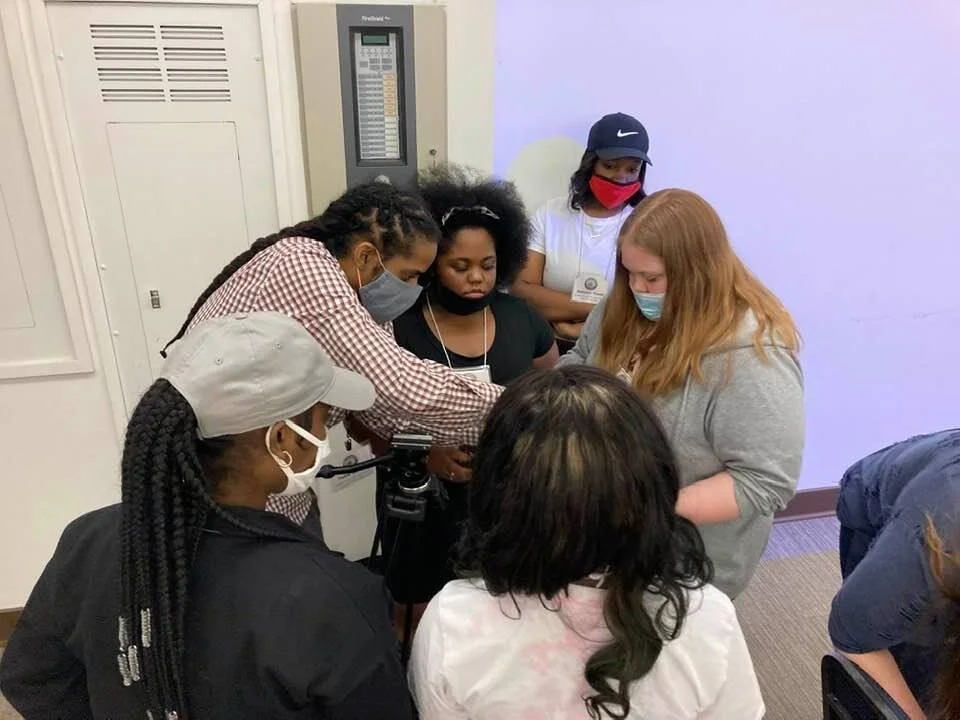 Students of the 2021 Youth Filmmaker’s Workshop setting up for an interview.