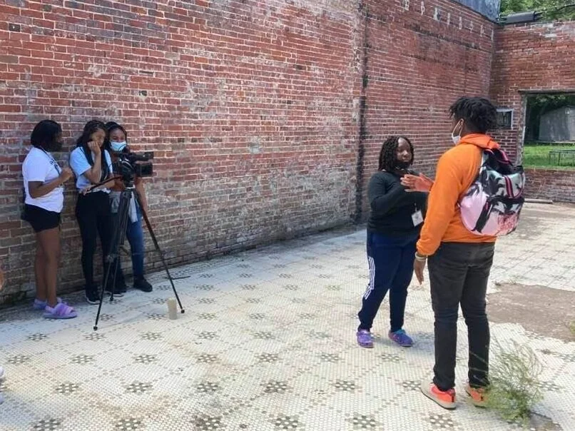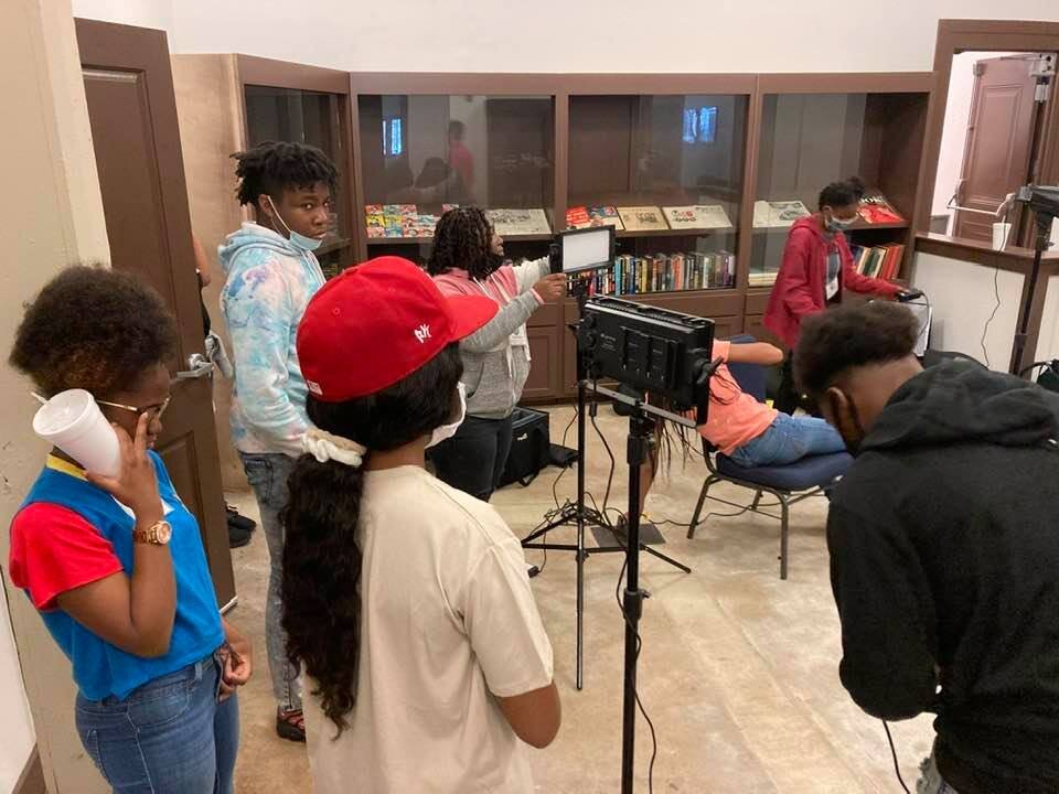 Students of the 2021 Youth Filmmaker’s Workshop filming a scene for their final video.